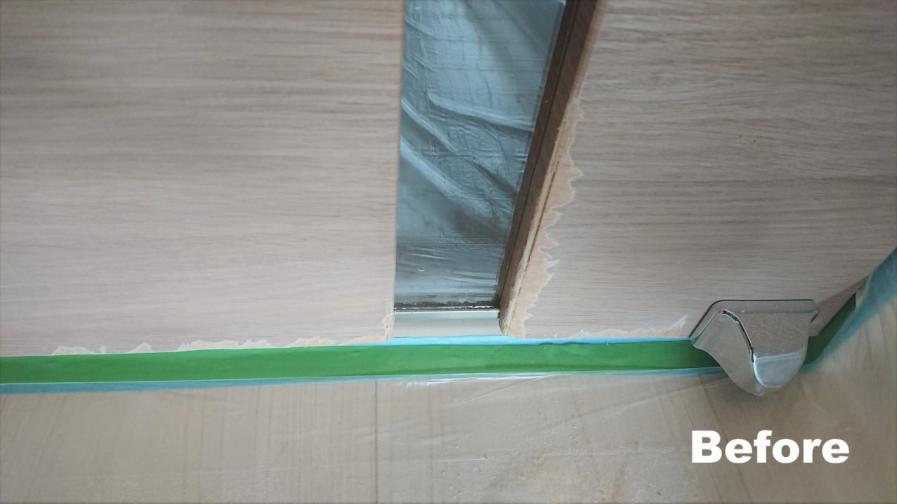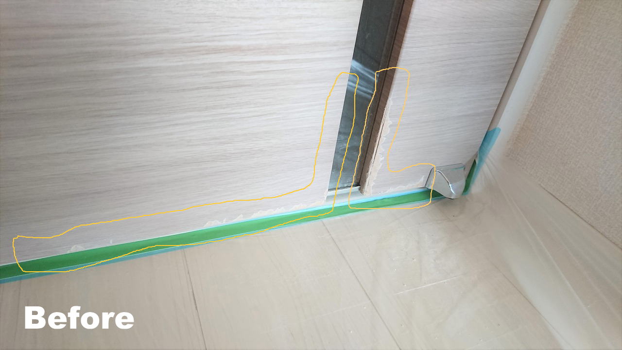 室内ドアのふちがガリガリになった状態です。最近のドアは木目調等のシート仕上げのものが多いですが、割と簡単に剥げてしまったり傷が入ってしまいます。