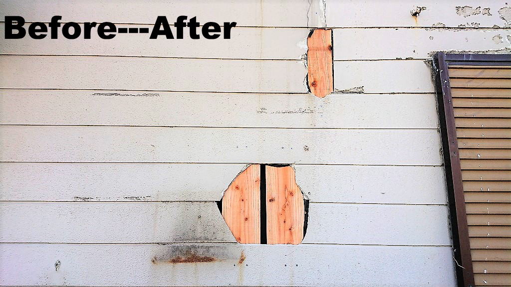 元々、壁全体が傷んでいる様子ですが、壁のやり直しとなりますと大変な出費となりますので、今回は、とりあえず応急処置として外壁を塞いでほしいとの要望でした。