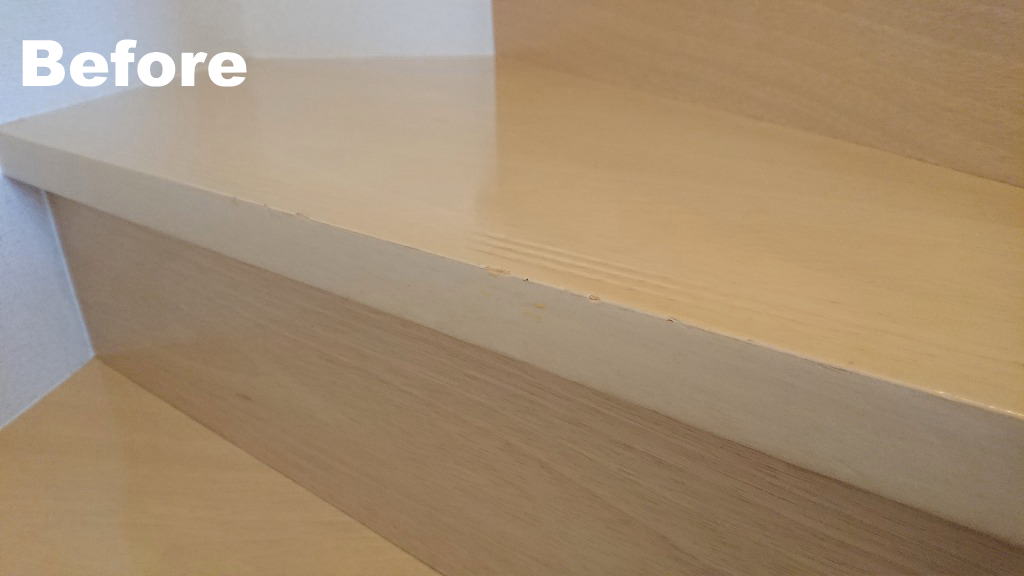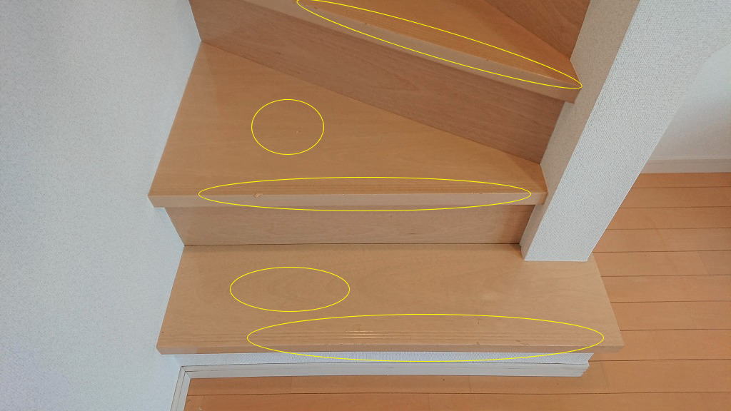 ほとんどのお宅では、階段照明に弱目の照明が付いていて薄暗いところが多いです。そのため、基本的には多少の傷が出来ても、それほど目立ちません。