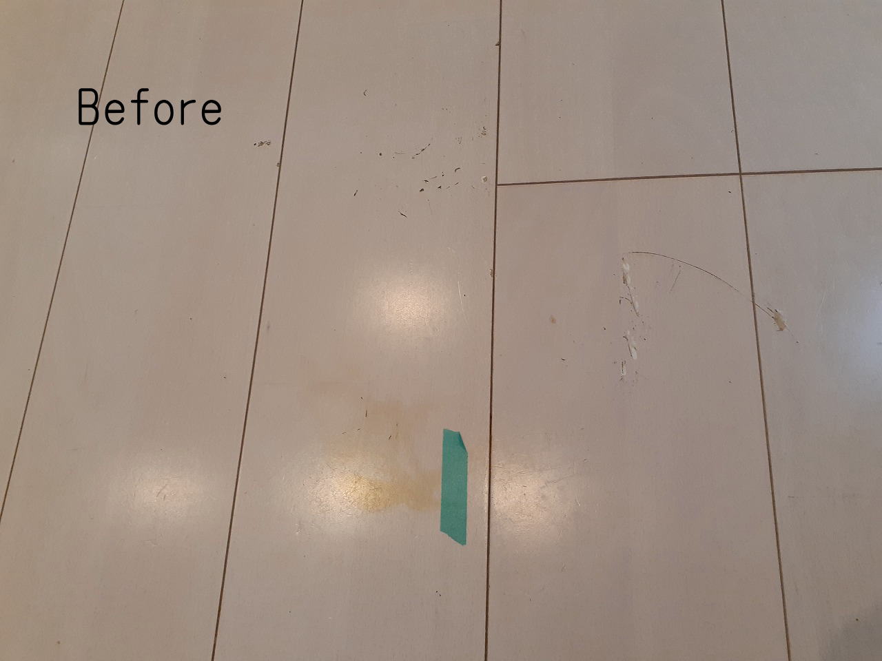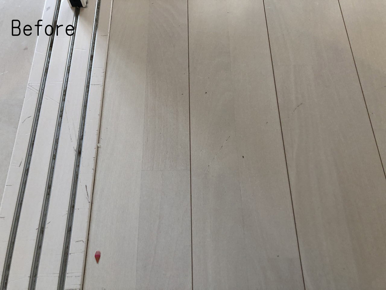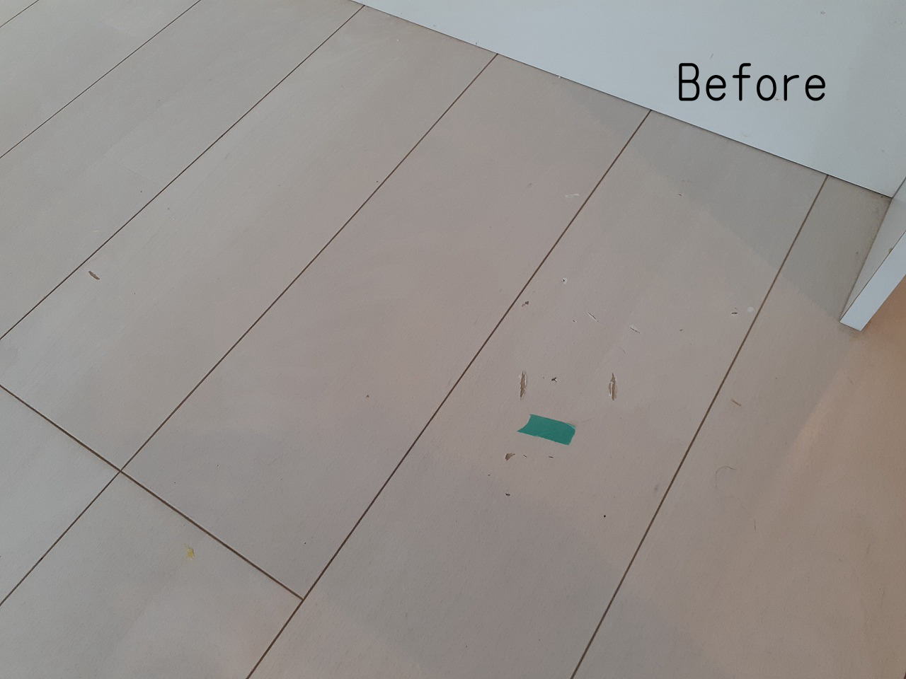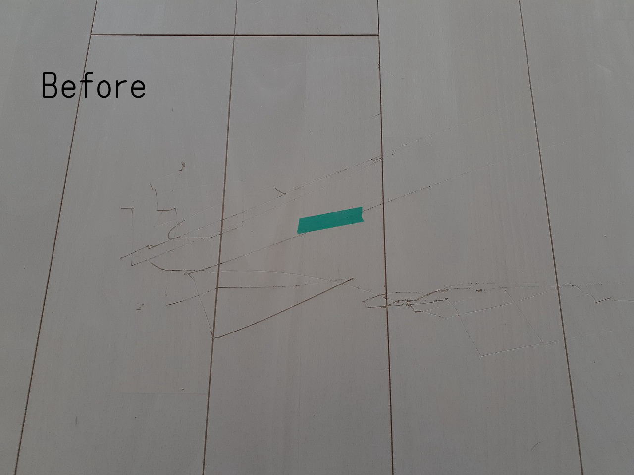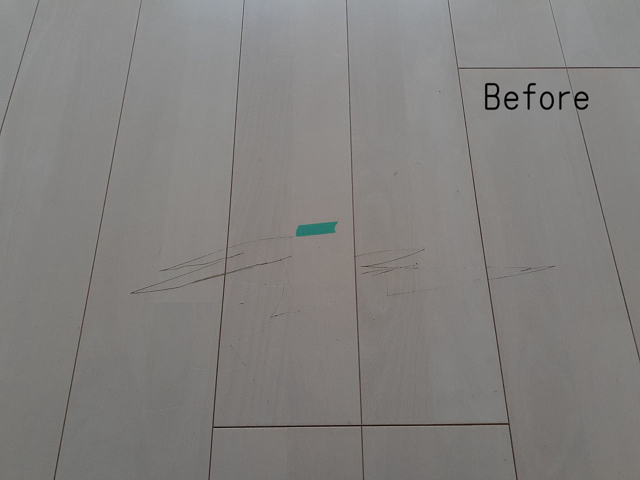 R05.3.19 熊本市中央区 賃貸マンション 傷多数のお部屋で、写真はその一部になります。 大きな傷は全体的にボカして目立ちにくくしています。大小多数の傷がありましたので、最終的には部屋に入った時の印象、傷の目立ち方は随分収まった様に感じました。 施工箇所 リビング床 玄関框 間仕切レール