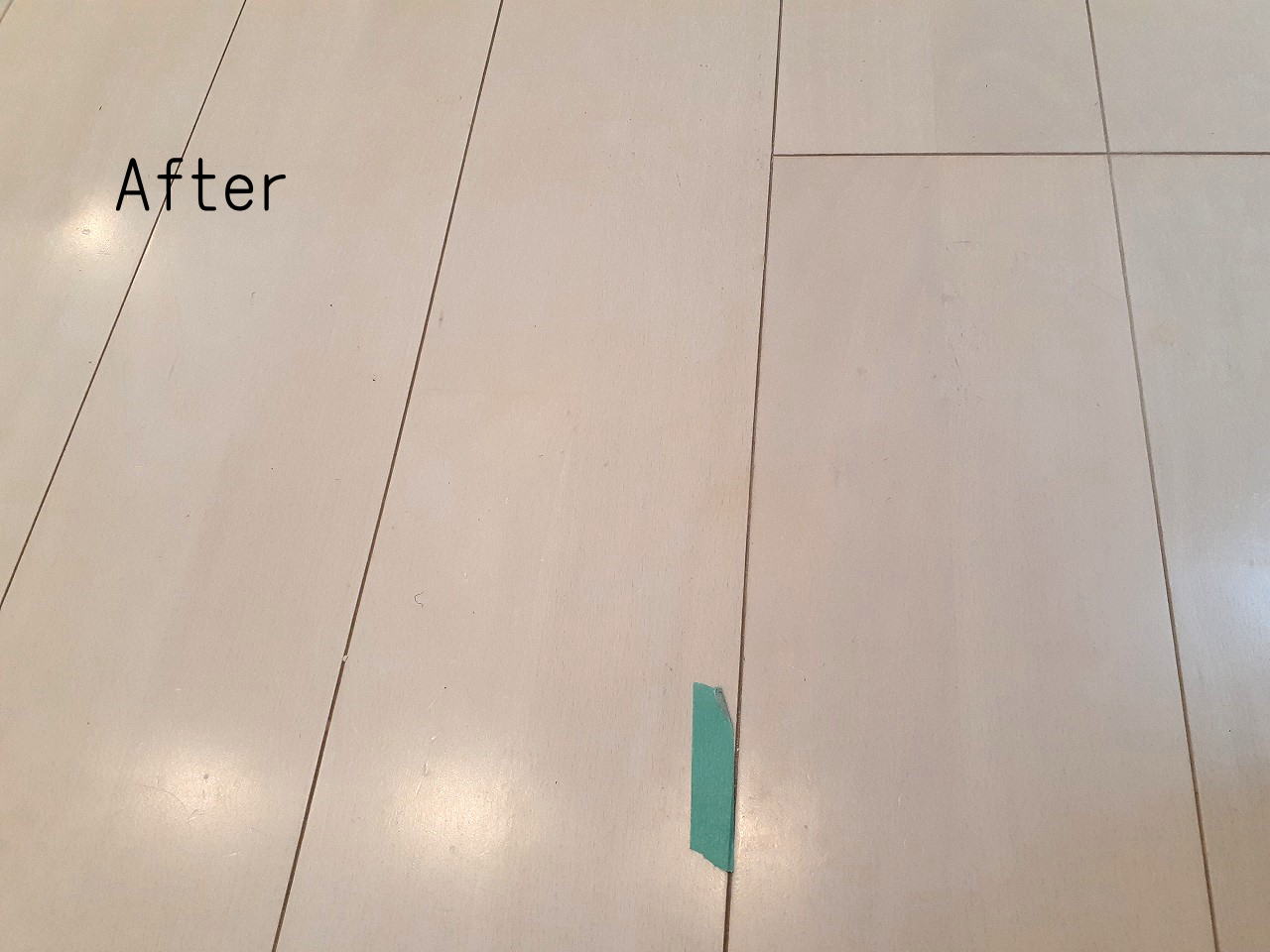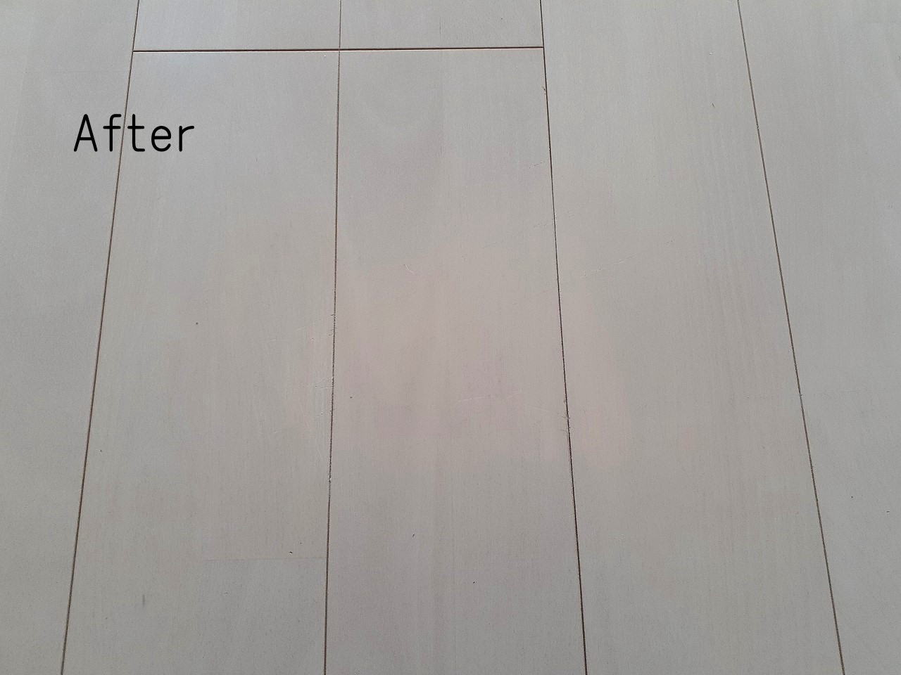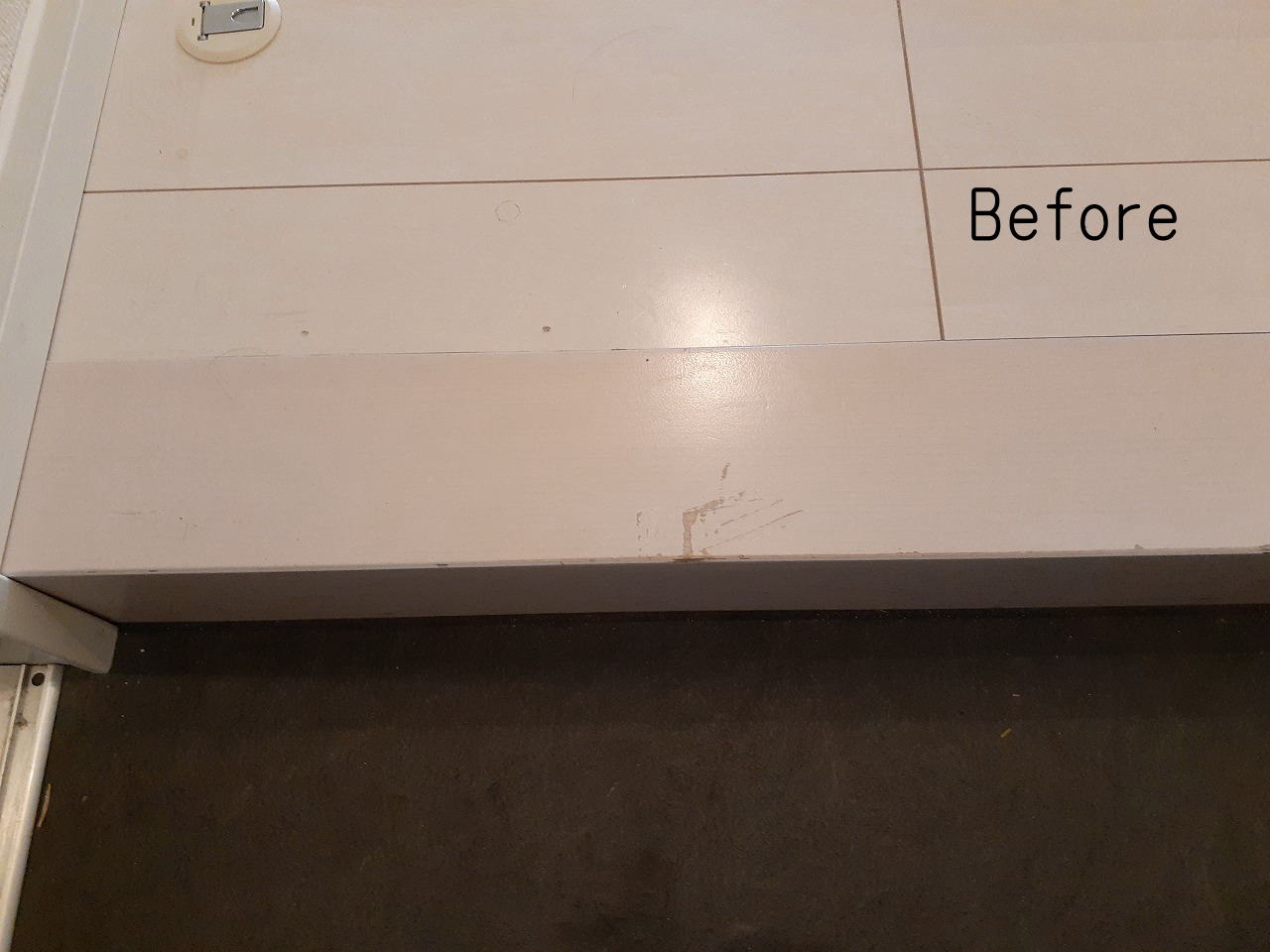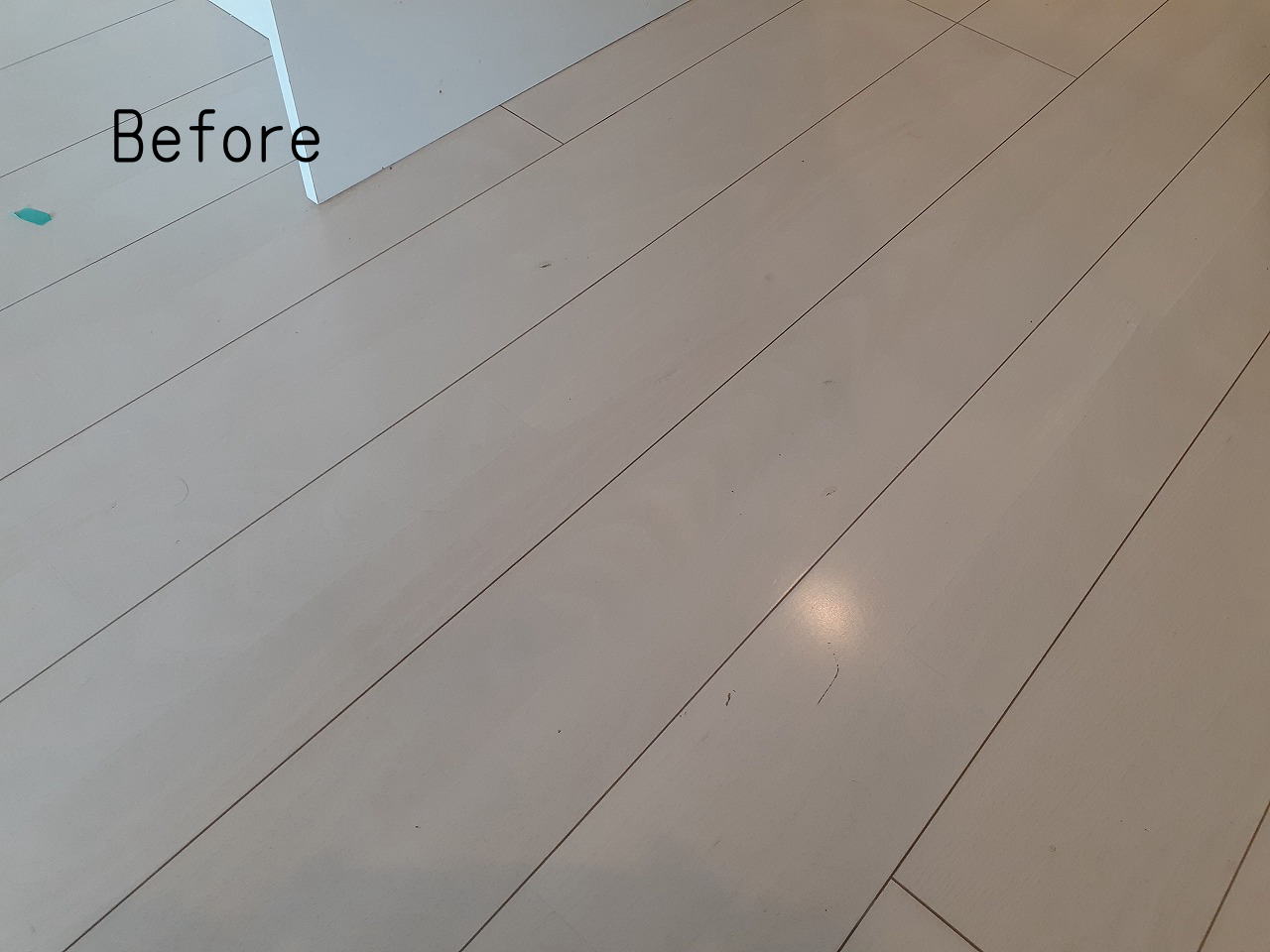 R05.3.19 熊本市中央区 賃貸マンション 傷多数のお部屋で、写真はその一部になります。 大きな傷は全体的にボカして目立ちにくくしています。大小多数の傷がありましたので、最終的には部屋に入った時の印象、傷の目立ち方は随分収まった様に感じました。 施工箇所 リビング床 玄関框 間仕切レール