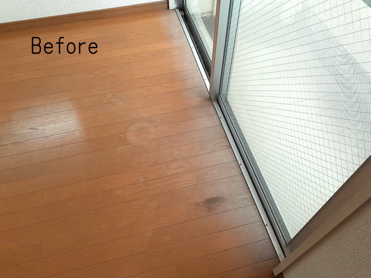 R05.4.16 熊本市中央区 賃貸マンション 色褪せたフローリングの補修です。 バルコニー側のフローリングは年数が経つと大体こうなります。結露が重なるともっと酷くなります。 色褪せて白っぽくなった部分にベース色を塗りこむだけでもこれだけ見た目が回復します。 もちろん、フローリングにある程度の強度が残っているのが前提にはなりますが、そのままで古さ全開のお部屋は割と多いと思いますので、ぜひメンテナンスしてみてはいかがでしょうか。 施工箇所 リビング床