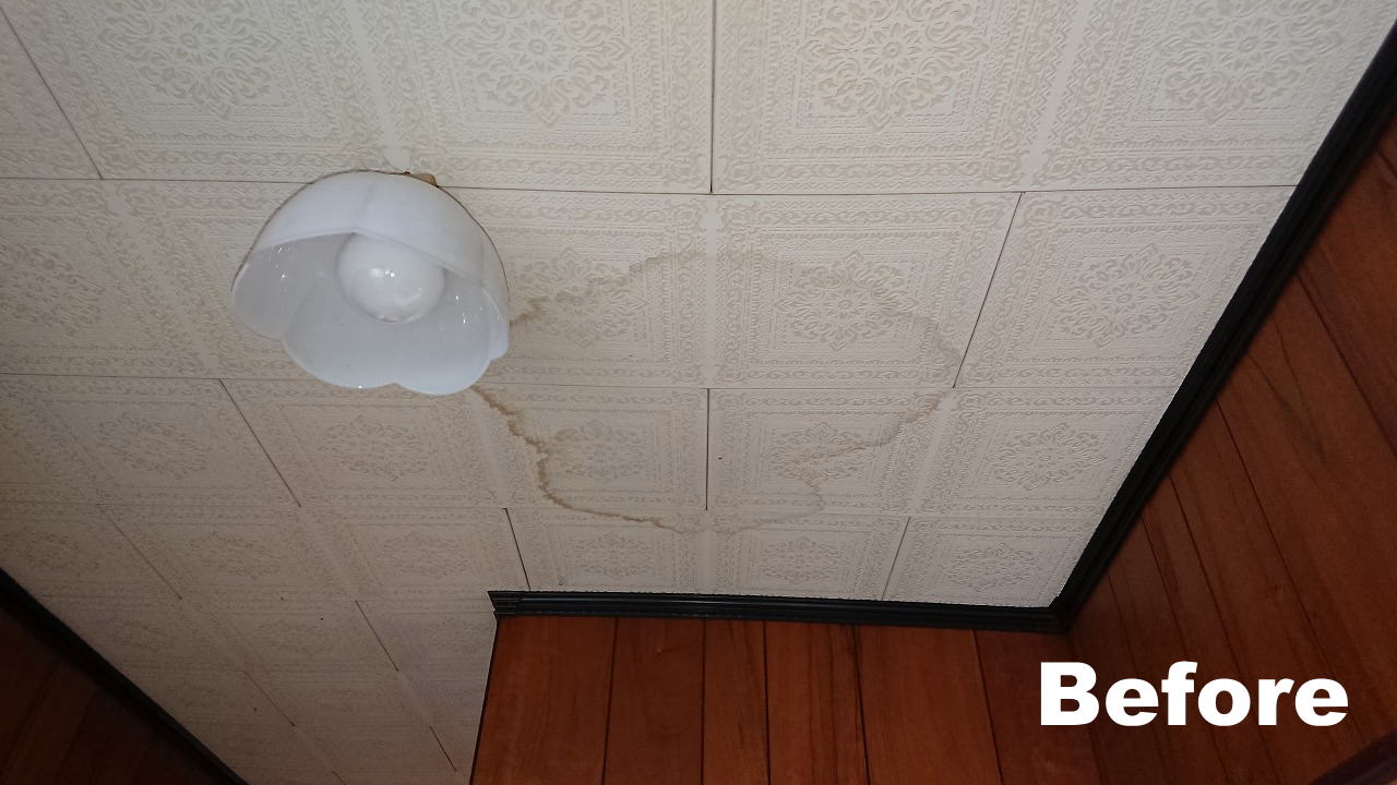 H30.9.1 熊本市東区 戸建て貸家 こちらは玄関天井の雨染み痕のシミ消し補修になります。もちろん、雨漏りは既に対処済みです。 賃貸ですので、雨漏りの痕はとてもマイナスイメージになりますね。せっかく雨漏りが解決しても、シミがそのままになっていれば、それを見たお客様は「今も雨漏りしているのかな」と心配になります。 気持ちよくお部屋選びをしてもらう為にも、しっかりと美観の維持には気を使いましょう。 施工時間 / 約1時間