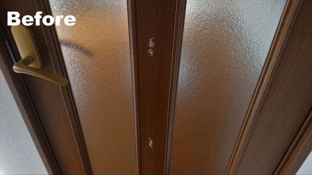 これは室内ドアのシート剥がれになります。ドアに何かを貼っていたのでしょう。粘着性の強いモノだと剥がす際に下地のシートも一緒に剥がれてしまいます。