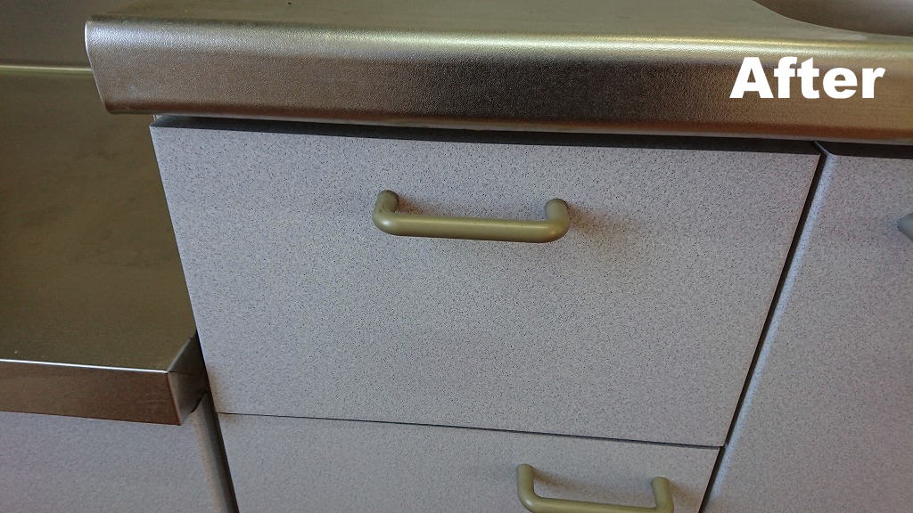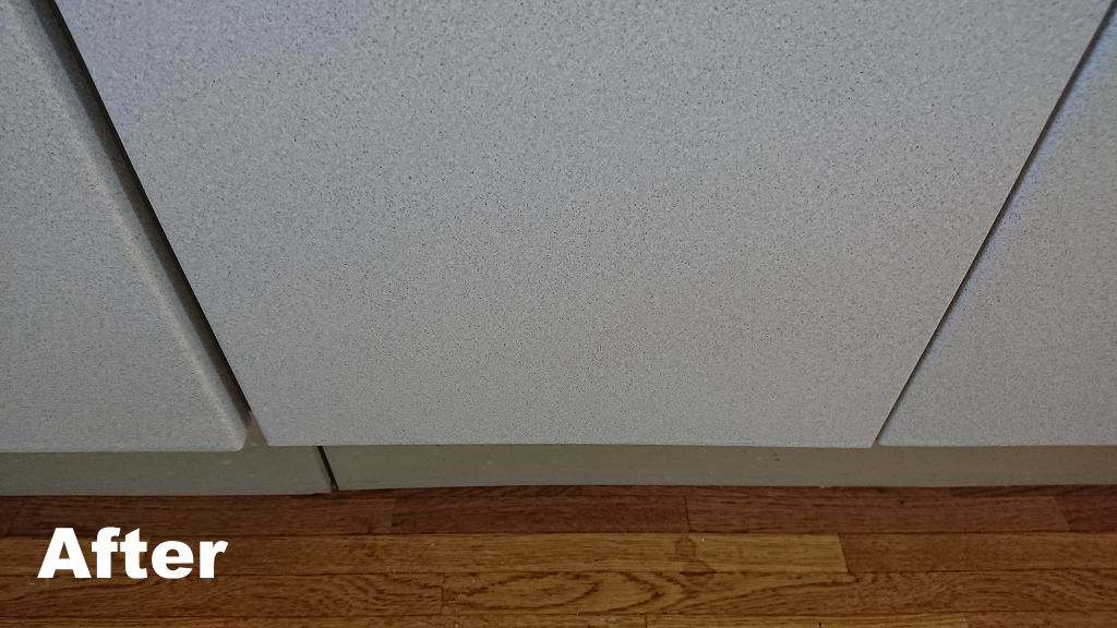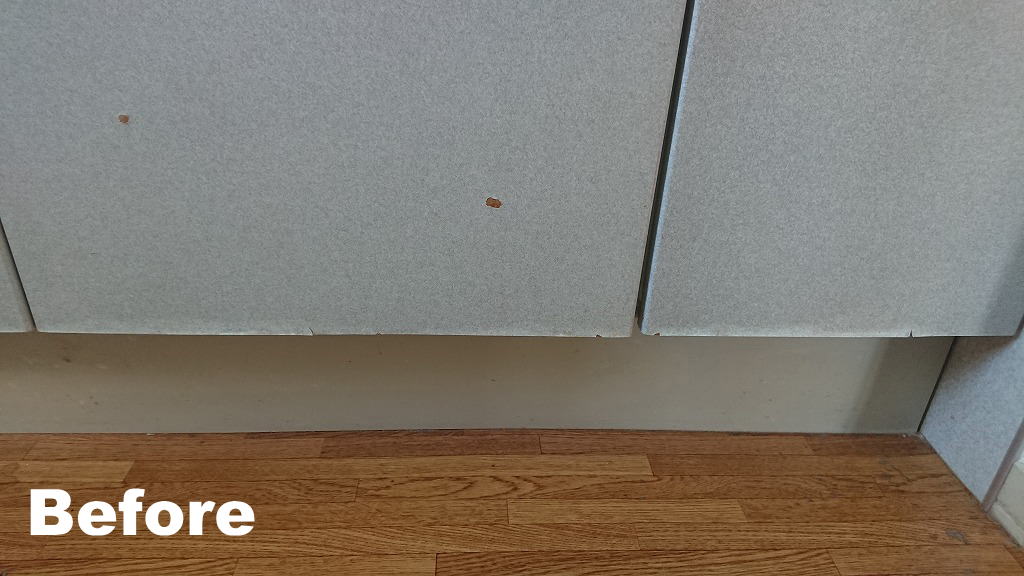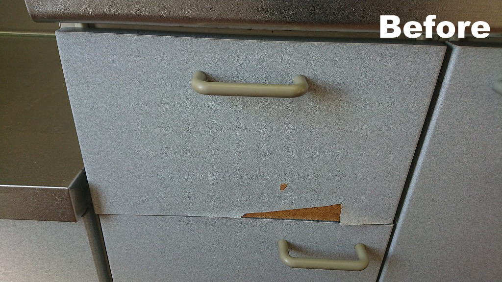 MDFボードの上に化粧シートが貼られておりますが、経年で端の方が剥がれ、そこからボードが湿気を吸って膨張していました。部分的にシートも剥がれていたりで、次の入居に備えて綺麗にする必要があります。