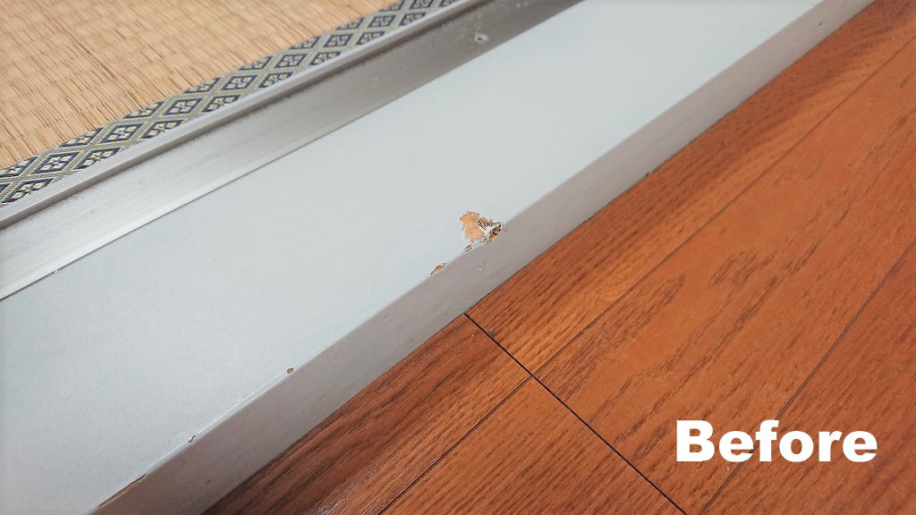 引っ越しシーズン中には、退去後のお部屋でこの様な傷をよく目にします。家財を持ち運ぶ際にガツンと引っかけてしまうのです。