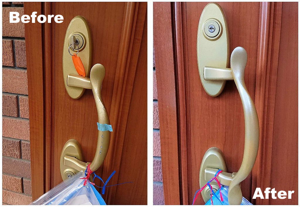 H31.4.2 熊本市中央区 賃貸アパート 今回は、玄関ドアノブのガリ傷補修です。 ドアノブには、気付くと結構たくさん傷がついています。こちらの賃貸は、レンガ調のとても雰囲気の良い物件ですが、入口の玄関に目立つキズがあると何だか残念になりますね。 下地処理をして同系色で塗装、最後にクリア塗装して仕上がりです。 ガリガリっと剥げた嫌な感じはなくなり全体的に馴染んだように思います。 玄関ドアに限らず、室内ドアのノブも奇麗になりますので、ぜひお尋ねください。 施工箇所 玄関ドアノブ ガリ傷 約30分