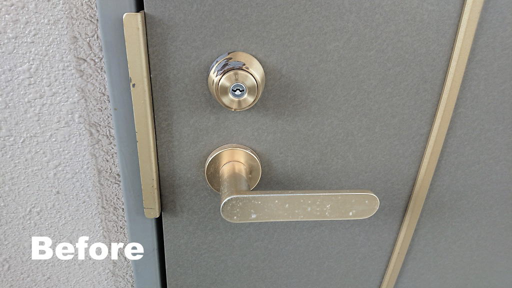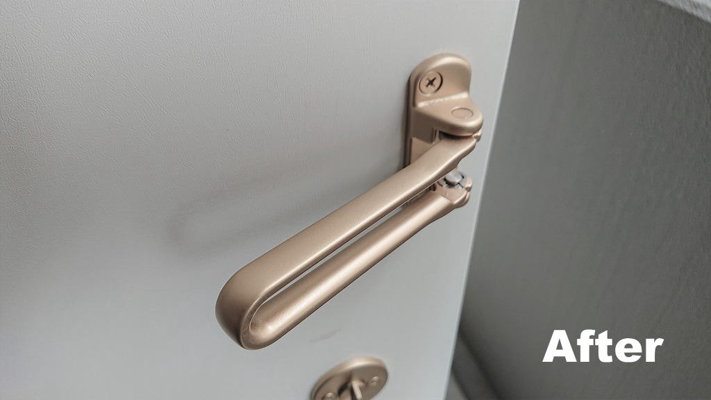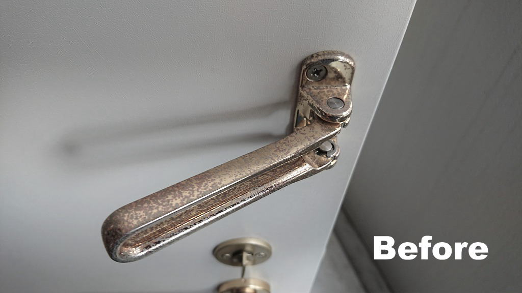 R01.7.11 熊本市中央区 賃貸 賃貸マンションの玄関ノブ、U字ロックの美化メンテナンスです。 築12年も経つと金属パーツはサビたり変色したりします。この様なメッキ部分も同じです。 同じ色があれば良かったのですが、近い色であればOKとのことで下地調整をしたのちに簡易塗装を行いました。最後にコーティングして終了です。 お部屋を奇麗に保つアイテムとしてぜひ活用して頂ければと思います。 施工箇所 玄関ノブ、U字ロック等 約2時間