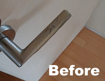 R01.8.30 熊本市北区 室内ドアノブ補修です。金属地のノブで保護剤が剥がれ金属がサビています。 綺麗に保護剤をサンディングし、金属面を磨いてから改めてクリア塗装します。 トイレ等の黒ずんだノブは嫌がられます。いくら綺麗に掃除していても「汚い」と印象付けられてしまいます。賃貸では大きなマイナスイメージです。 簡単にメンテナンス出来ますので、うちもそうかなと感じた方はぜひお尋ねください。 施工箇所 室内ドアノブ補修 約0.5時間