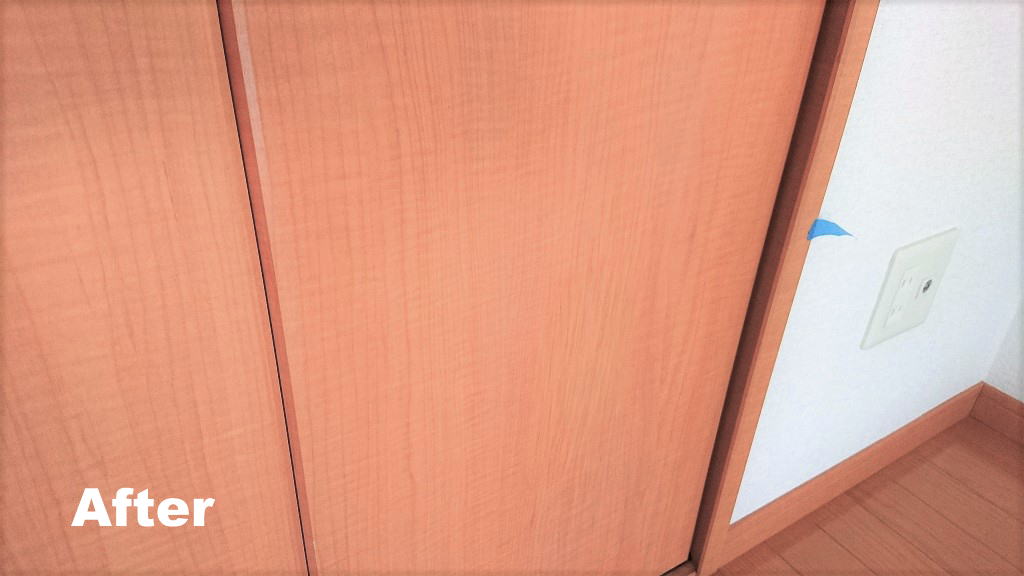 あとの写真はクローゼットの陥没補修になります。こちらは割と小さ目でしたので下地処理をした後に調色してタッチアップで仕上げました。