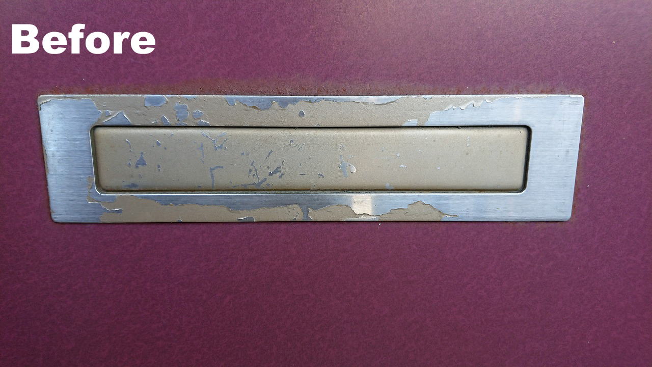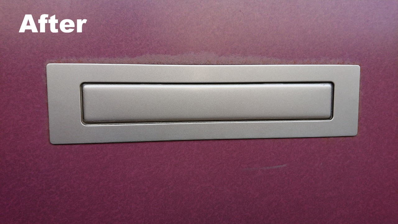 賃貸マンションの玄関ドアポスト(投函枠)の塗装剥がれを補修しました。