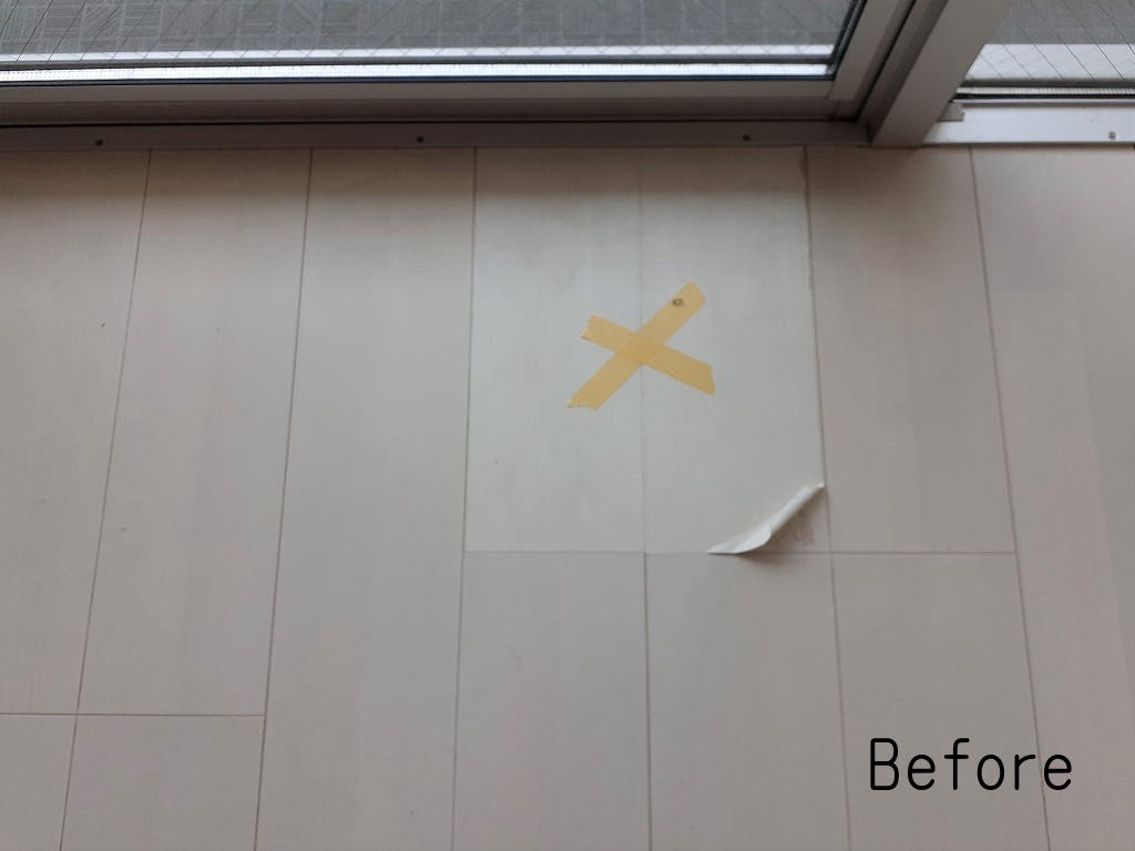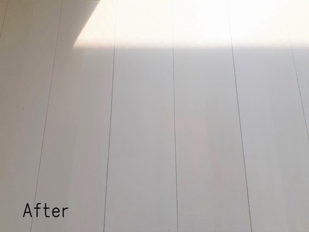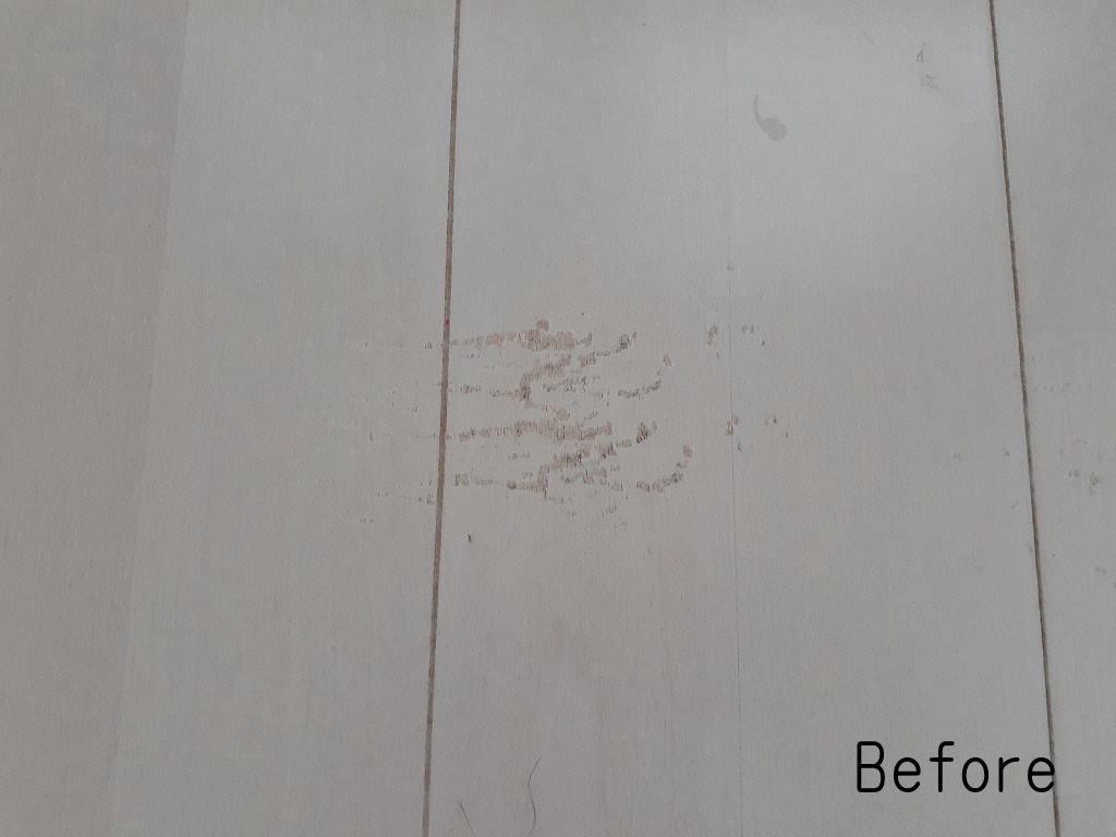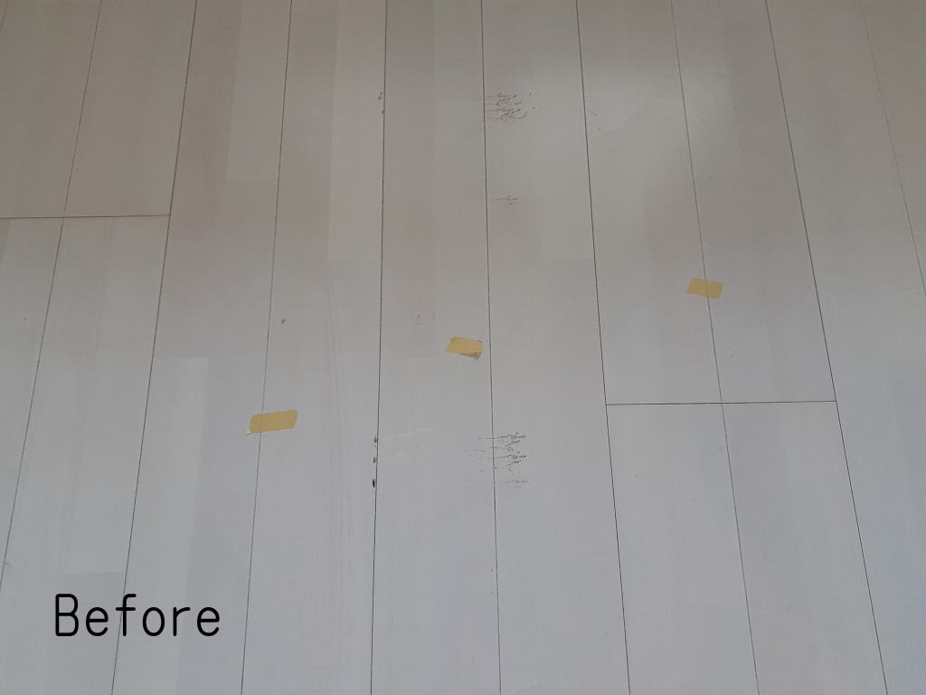 作業工程としては、毎度になりますが下地調整をしてベース色の着色、色味の調整をして最後仕上げになります。白系のフローリングですから傷がよく目立ちます。