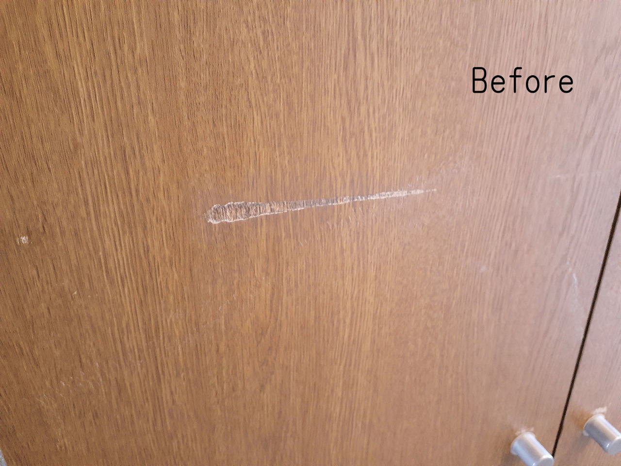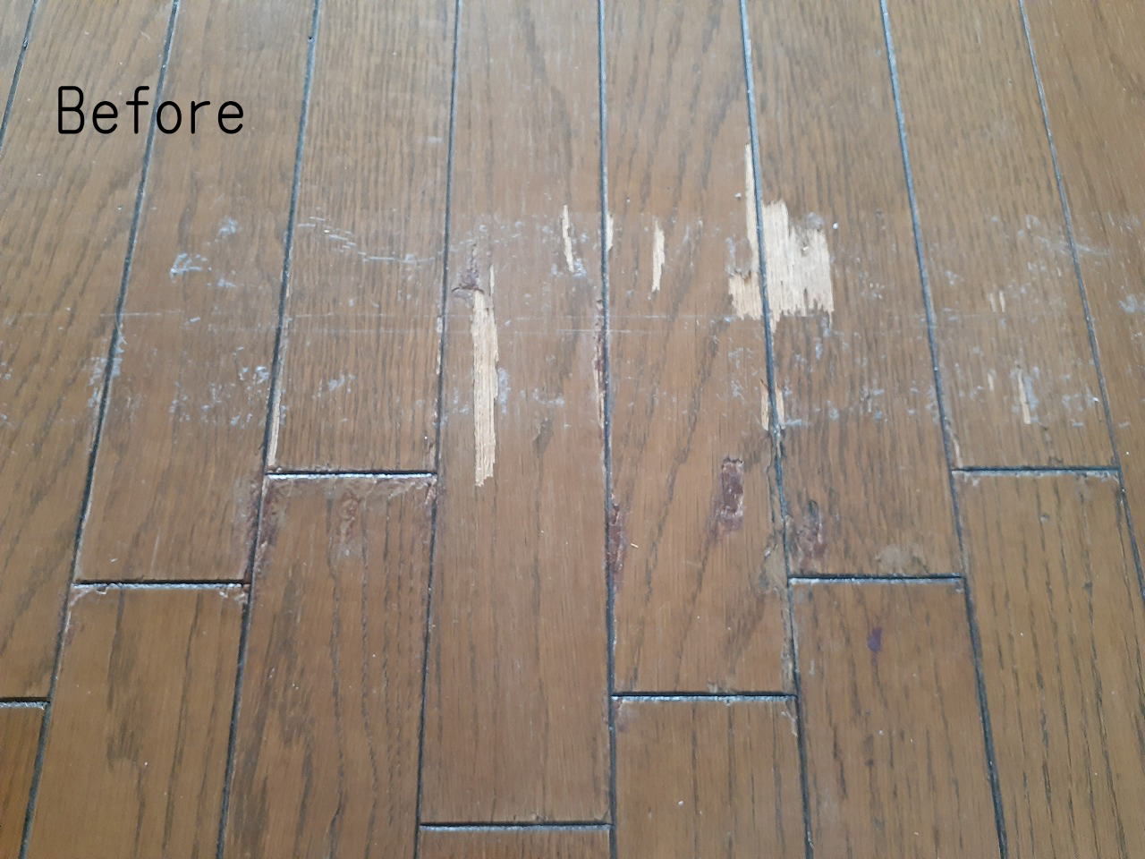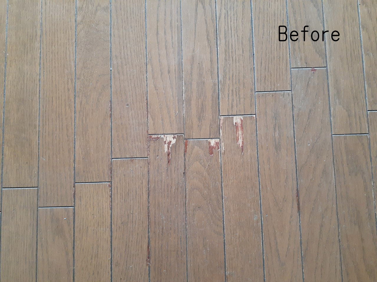 R05.2.18 熊本市中央区 賃貸マンション 老朽フローリングの剥がれ補修です。正直、限界は通り越しているフローリングです。 何とか、もうひと頑張りしてもらいたいとのご要望で、出来る限り見栄えの回復につとめました。 靴箱の扉に入ったガリ傷もボカシ補修を施しました。 全体的に傷の多いお部屋でしたので、局所的にキレイにするというよりは周囲に合わせるようなイメージで施工させて頂きました。 施工箇所 リビング 玄関