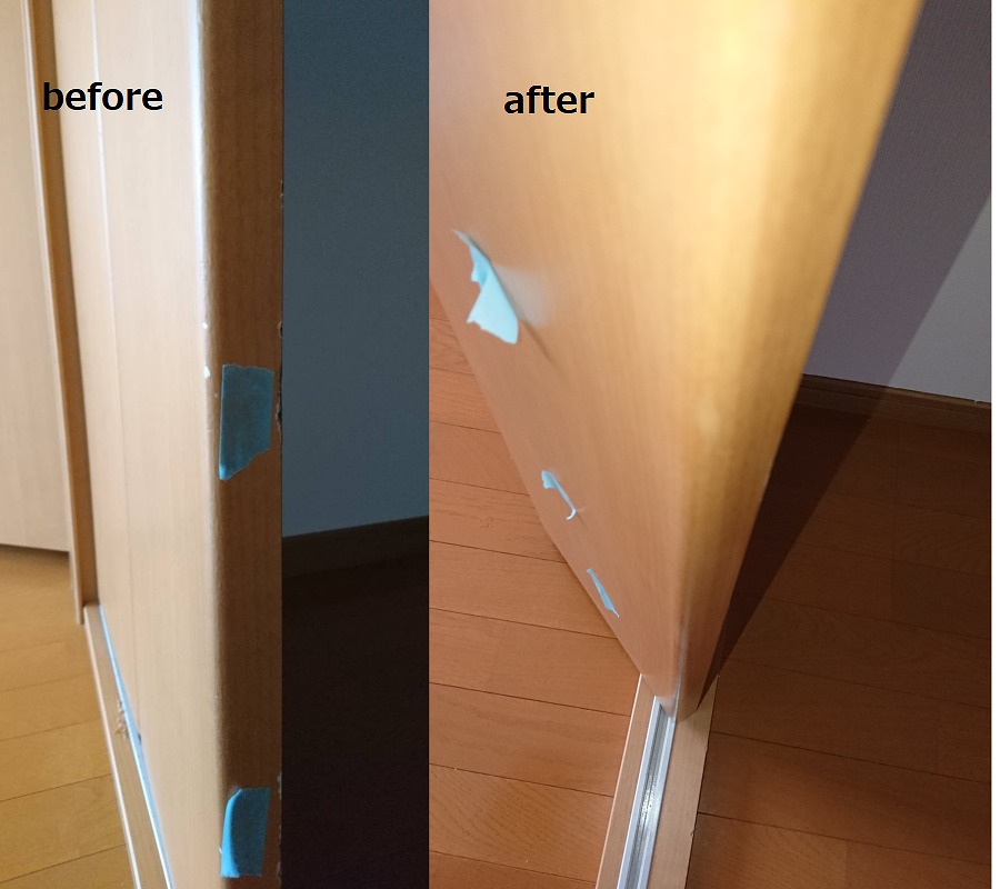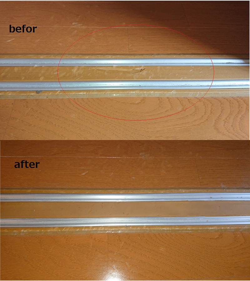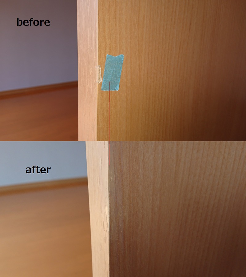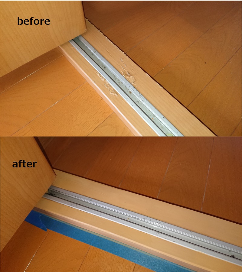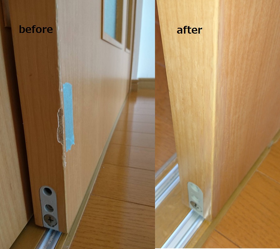 H30.8.9 益城町 賃貸アパート 室内木部補修 / 建具、建具枠、その他 ここでは賃貸アパートの原状回復に伴う木部補修事例をご紹介します。 建具枠の欠損、凹み傷など、ちょっとしたキズも積もれば山となってしまいます。小さな傷も沢山の量になれば必ず目に付きます。これくらいならいいか、というのも最初のうちで、きっと定期的なメンテナンスも必要になってきます。 小傷が気になる方には、ぜひリペアをおすすめします!! 建具欠損 仕切戸枠欠損 その他