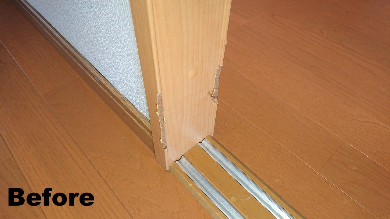 H30.8.9 益城町 賃貸アパート 間仕切戸/枠欠損 はっきりとした原因こそ分かりませんが、何かが当たって破損したことには間違いなさそうです。 部位・形状によっては、再形成が難しい場合もありますが、多少、派手なキズでも概ね目立たない程度のリカバリーが出来てしまうのもリペアのメリットです。 仕切戸枠欠損 / 約3時間