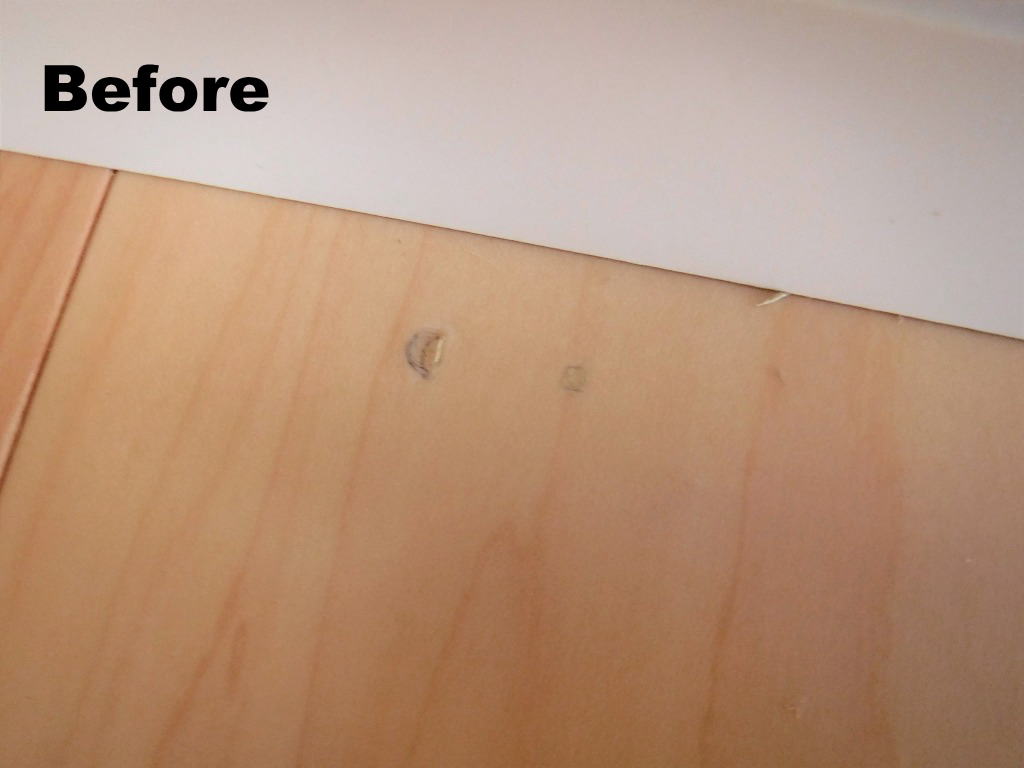 リフォーム中のお宅で貼り替えたばかりのフローリングに�工具を落としてしまったとのこと。資材を運び込んだりと、後付けの作業では細心の注意をはらっていても傷が付いてしまうことが多々あるのです。