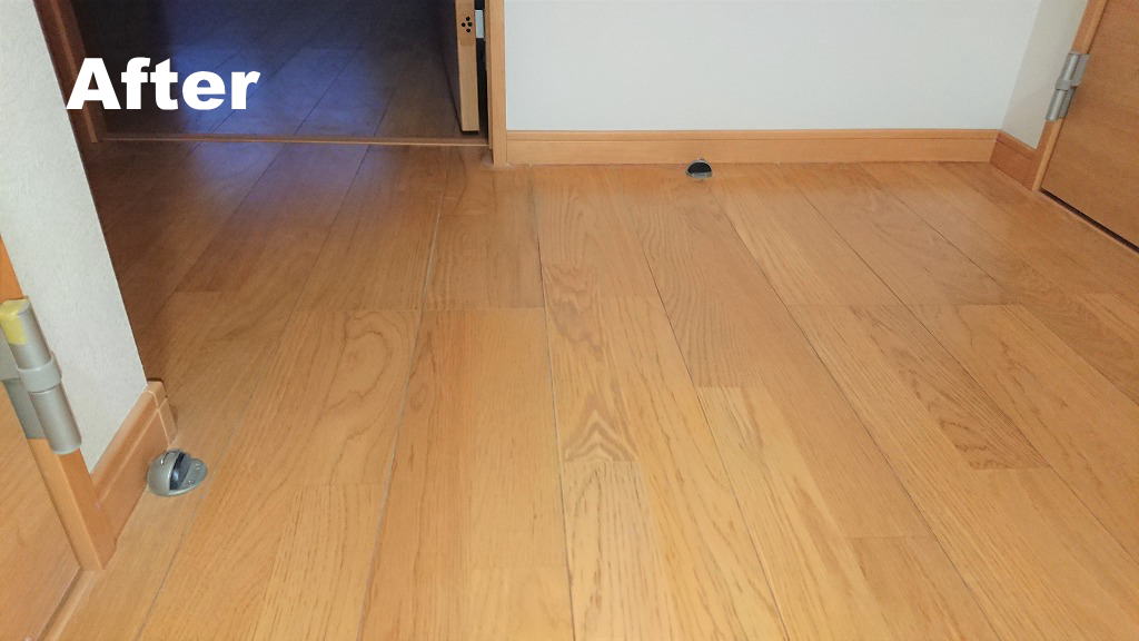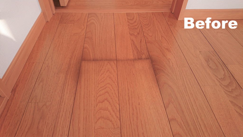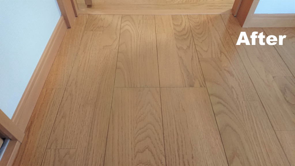 建築業者さんも、何とか目立たない状態で施主さんにお引渡しが出来ればということでご依頼がありました。フローリング自体は貼り替えたばかりとのことで、大した下地調整は必要ありませんでした。