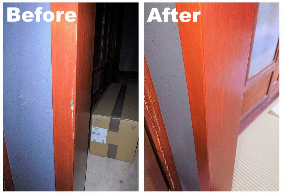 今回は、仕切り壁の柱(木枠)にできた陥没傷を補修しました。