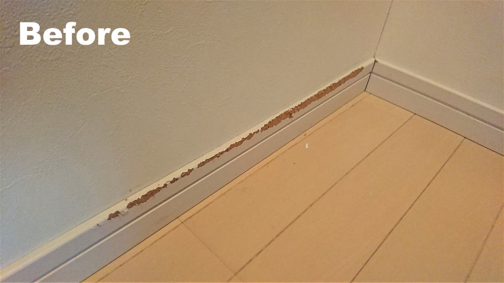家のお部屋には、皆さんご存知の様に、壁の下に巾木という部材が貼られていることが多いです。綺麗な状態であれば、部屋全体が締まって見えるものですが、ひとたび、キズが付いてしまうとスゴく気になってしまいがちです。