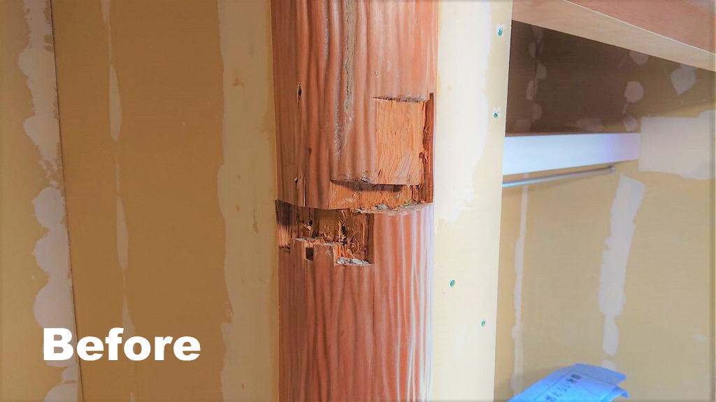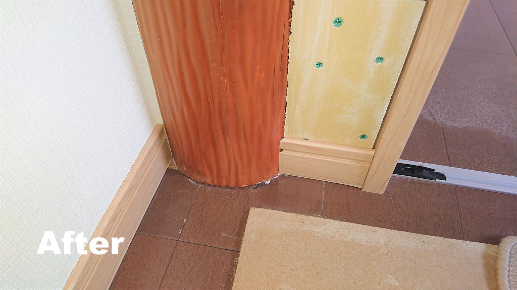 R1.6.28 柱補修 今回は、リフォーム現場からのご依頼で柱の補修をしました。 もともとは和室の押入れだったところを解体し、枠のついていた部分を整えるといった内容です。 ほげた部分のバックアップをしたのち、表面のスジ柄を再現、最後に調色、艶調整で終了です。 若干彫りが甘かったのが悔やまれますが、施主さんからも喜んでいただけたのでよかったです。 賃貸補修、リフォーム、自宅の補修、色んな場面でリペアは活用頂けます。 こまったキズなどあれば、ぜひご相談ください。 木部補修 和室の柱補修 約6時間